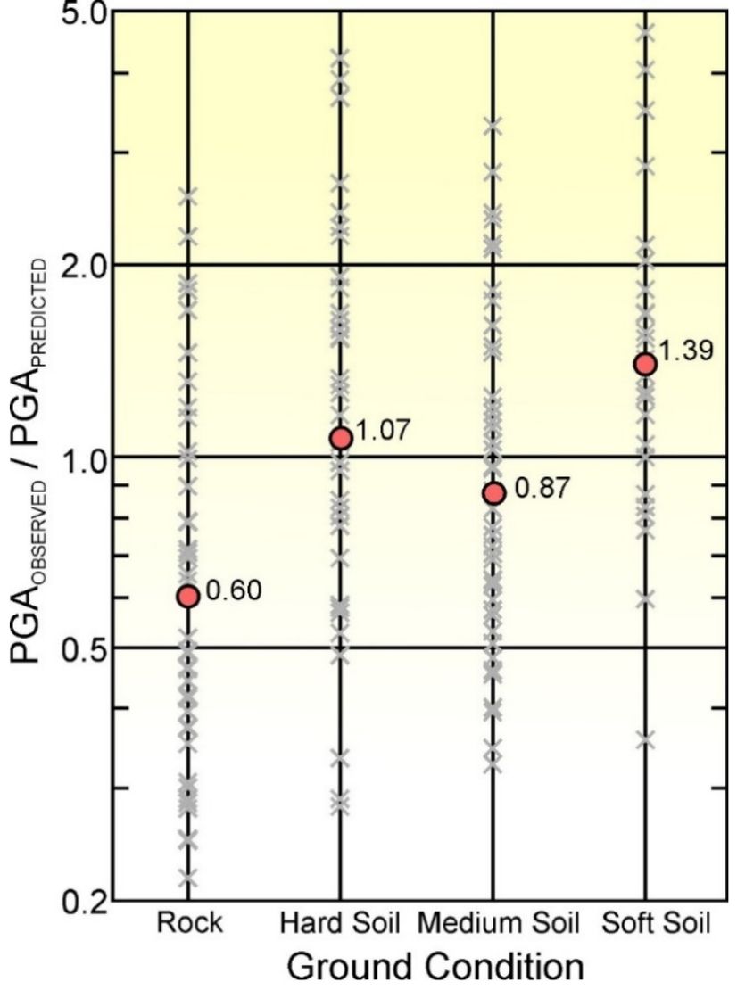 The figure above shows the variation of the peak ground acceleration ratios between observed and predicted values and mean ratios for rock, hard-, medium-, and soft-soil sites (figure adapted from Fukushima and Tanaka, 1990). The large variations are mainly related to the site characteristics, which can be estimated using the Seismic Microzonation service.
